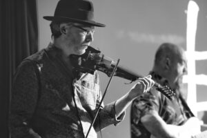 Violinist Jaime Lapeсa Del Rio hails from the north of Spain. Leslie met him some years ago and started doing gigs with him and hen invited him over to play with us. Jaime is a whirlwind on stage and broke the record at Forever Young Festival in 2022 for the fastest dash across the stage and back!!